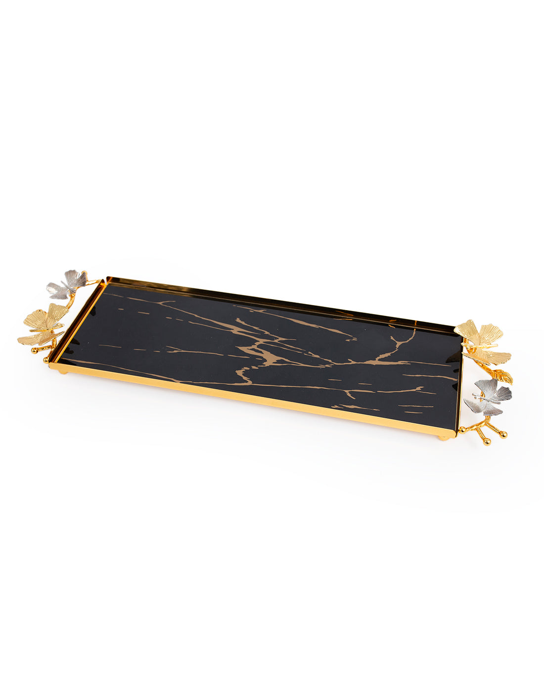 Black Marble Rectangular Tray with Gold & Silver Floral Handles β 35cm