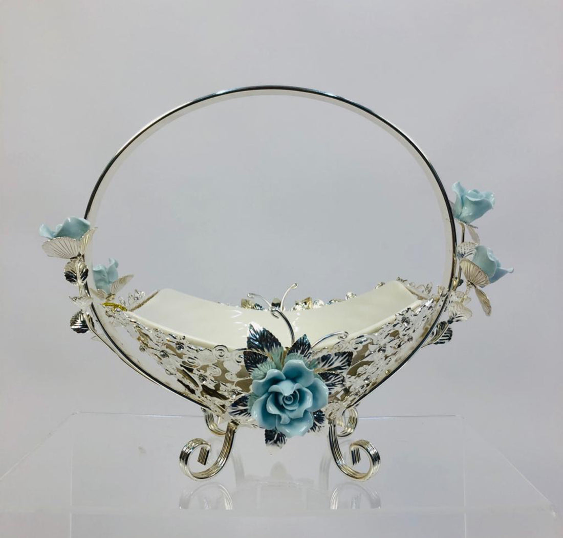Floral Elegance Serving Basketβ β Silver & Blue Decorative Bowl (Large)