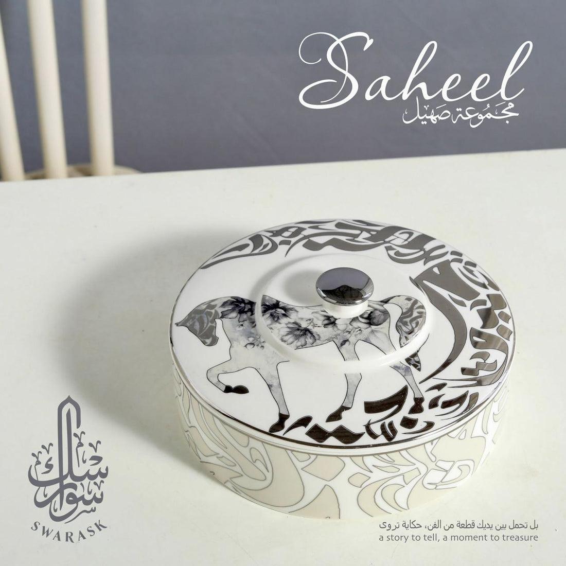 Saheel Luxury Porcelain Medium Serving Box β Arabic Calligraphy & Horse Design (GREY)