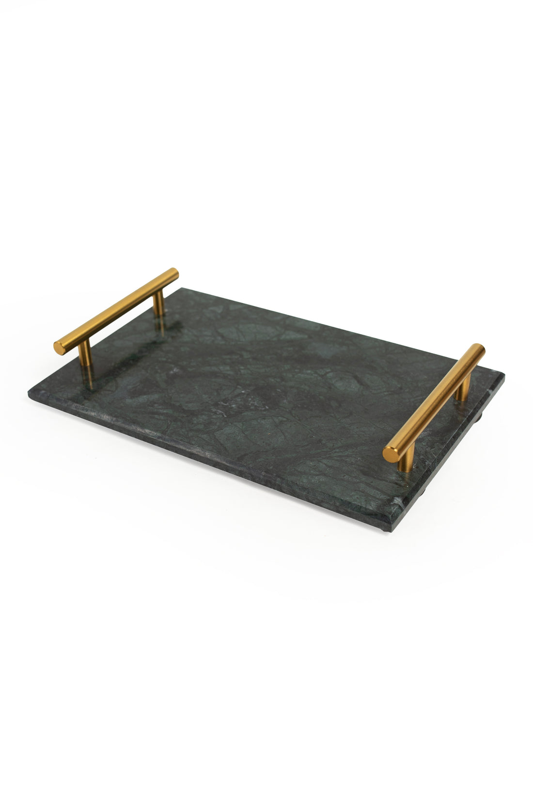 Midnight Marble Tray with Gold Handles Description:Crafted from rich dark marble with natural veining, this...