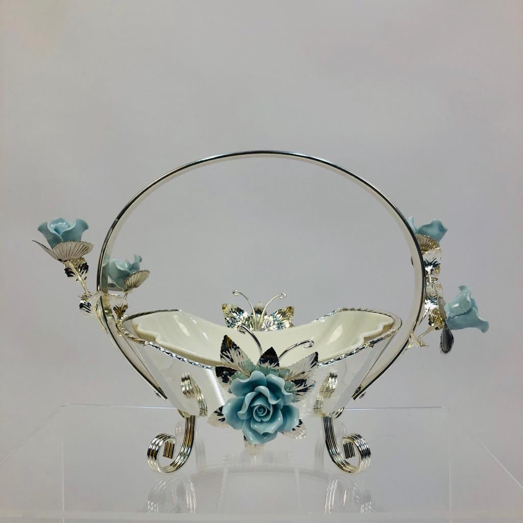 Floral Elegance Serving Basketβ β Silver & Blue Decorative Bowl