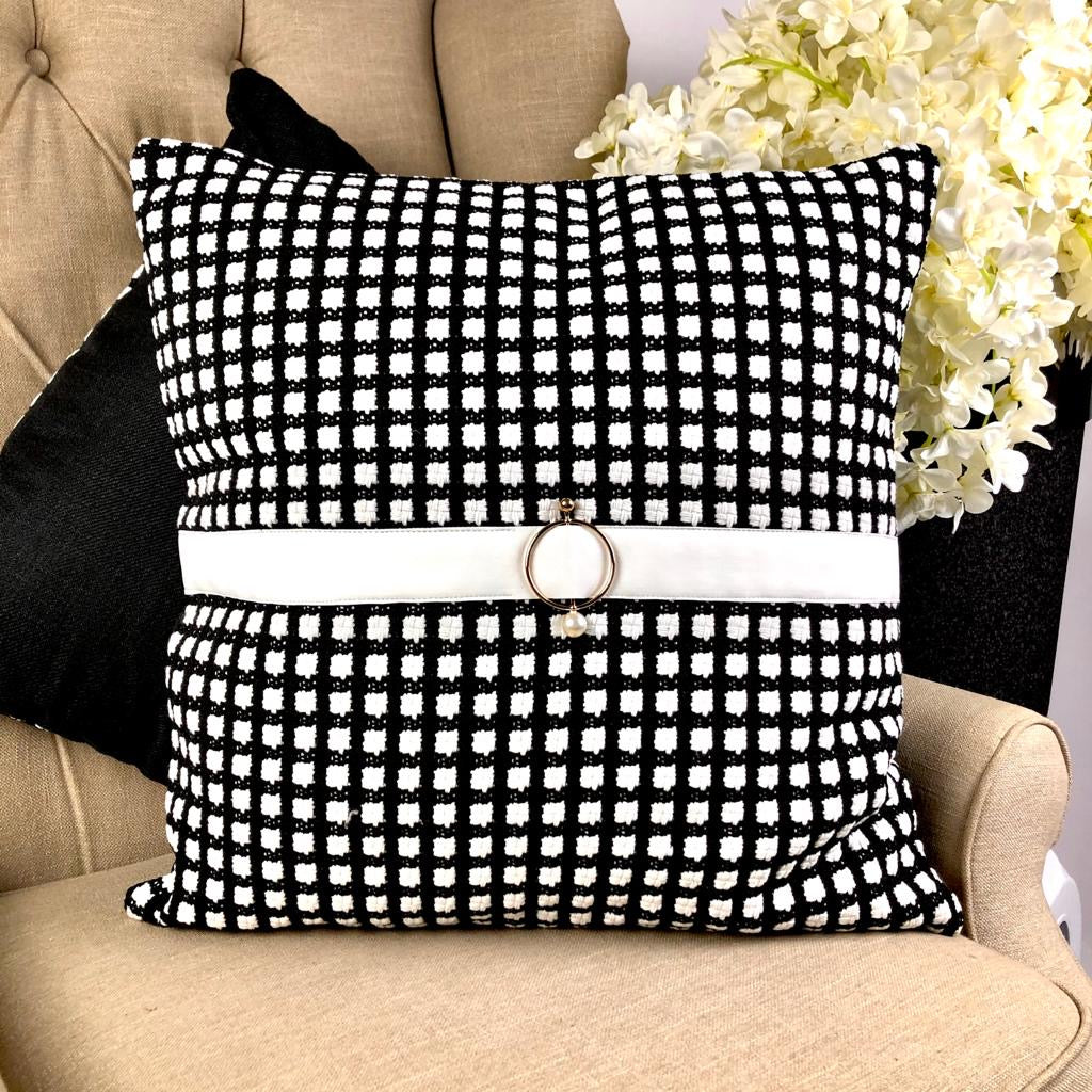 Kanz Royale Cushion β Black & White Tweed with Pearl & Rose Gold Detail (55x55cm)...