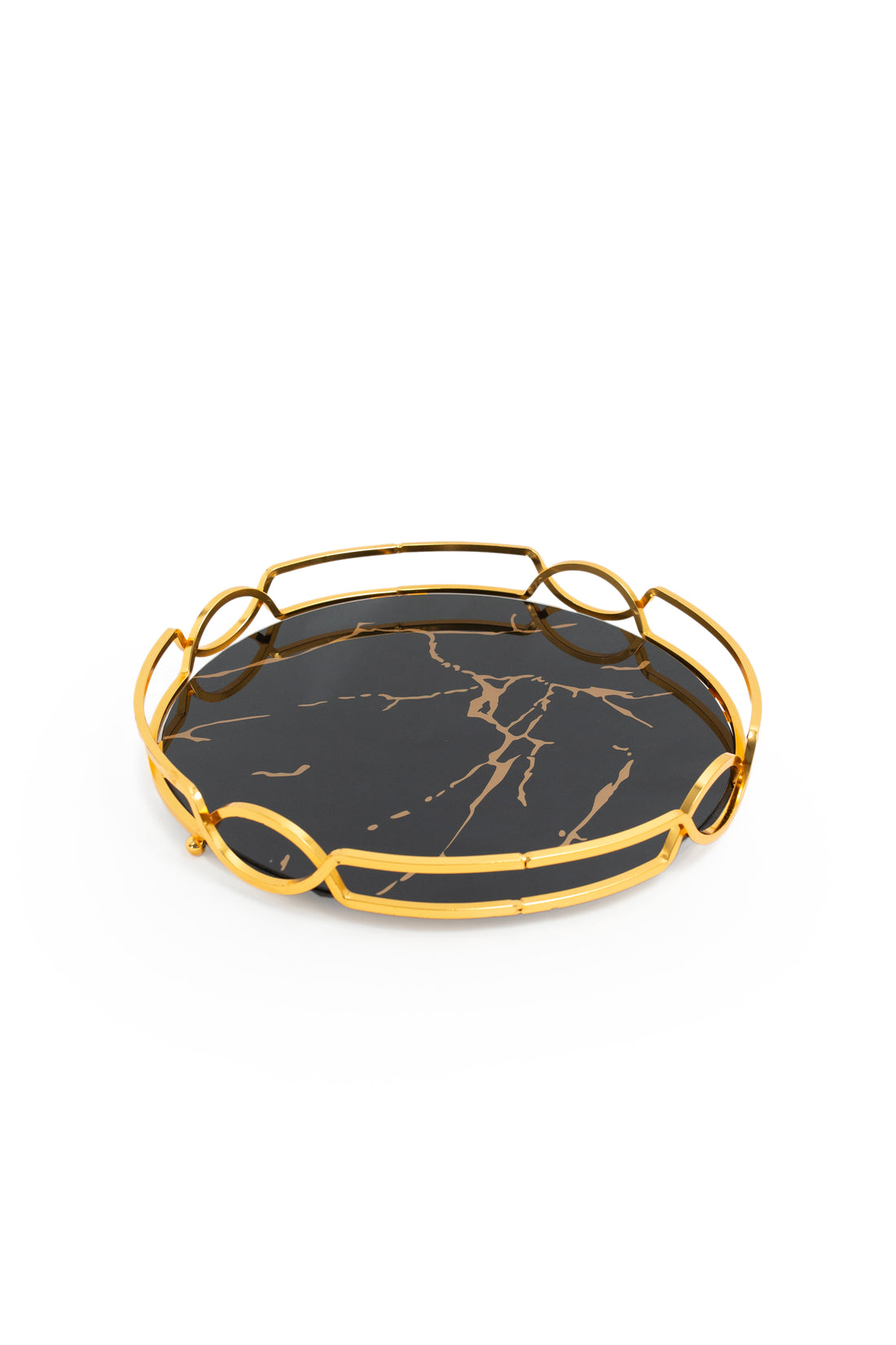 Round Black Marble-Effect Serving Tray with Gold Geometric Frame
