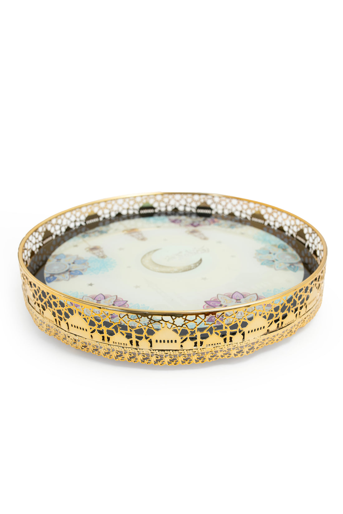Celebrate the season with this beautifully detailed Ramadan serving tray, featuring a round glass surface...