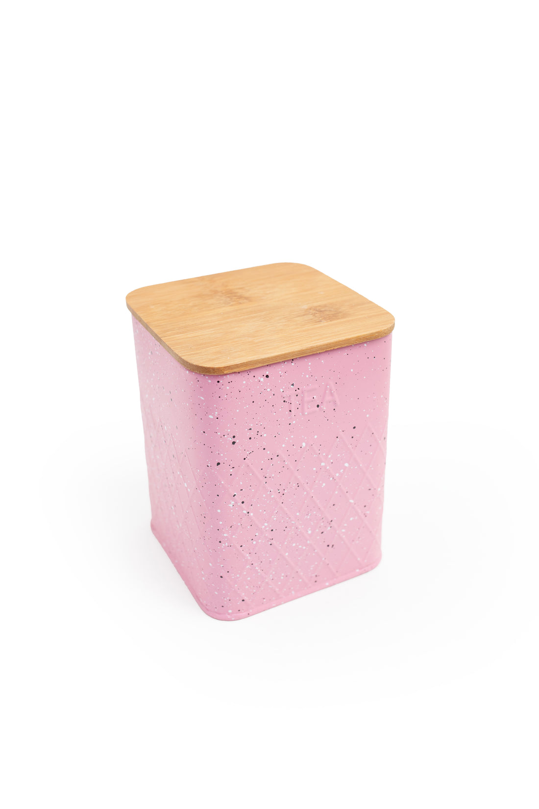 Pink Speckled Metal Canister Set with Bamboo Lids β Bread, Tea, Sugar, Coffee (4-Piece)