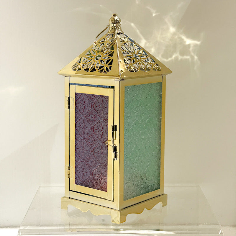 Gold Moroccan LED Lantern – Multicolor Embossed Glass & Battery-Operated Light