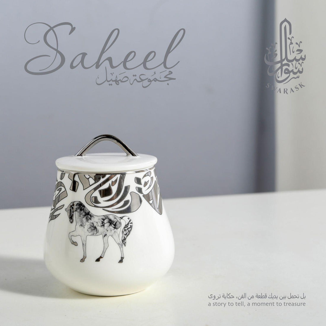 Saheel Luxury Porcelain Jar – Silver Arabic Calligraphy & Horse Design
