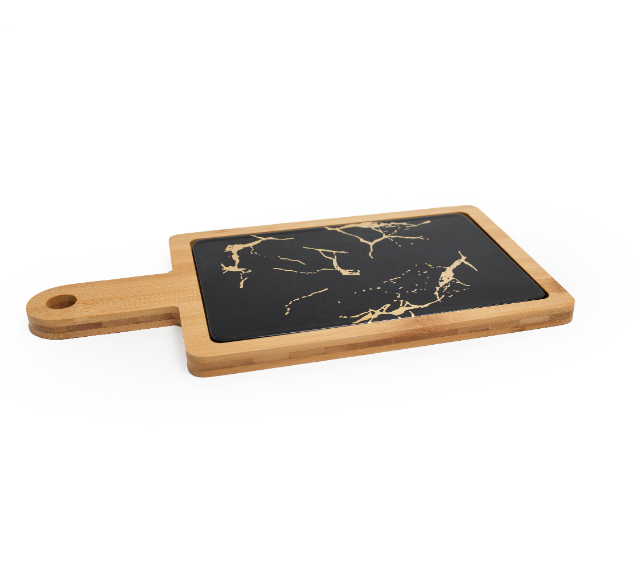 Bamboo Serving Board with Black Marble-Effect Inlay – Rectangular Paddle Design