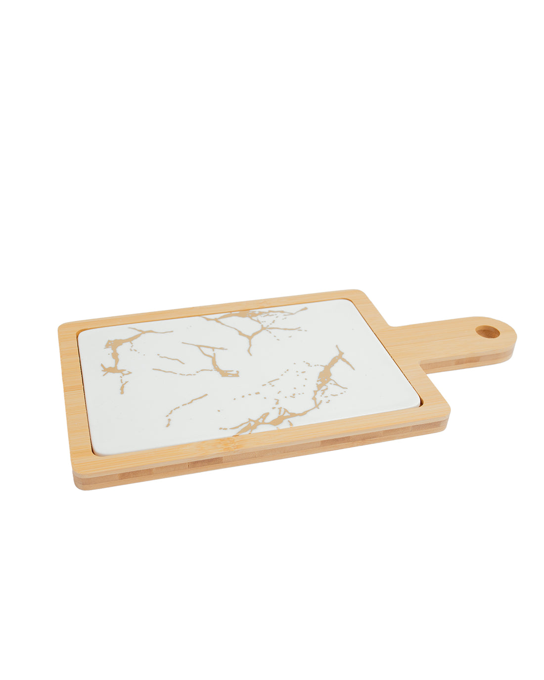 Porcelain Marble-Print Platter with Bamboo Base Product Description: Elevate your table presentation with this stylish...