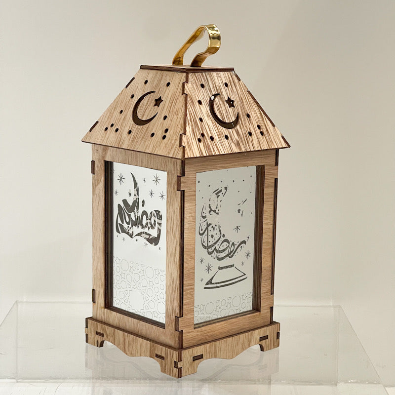 Wooden Ramadan Lantern – Crescent & Arabic Calligraphy LED Decor
