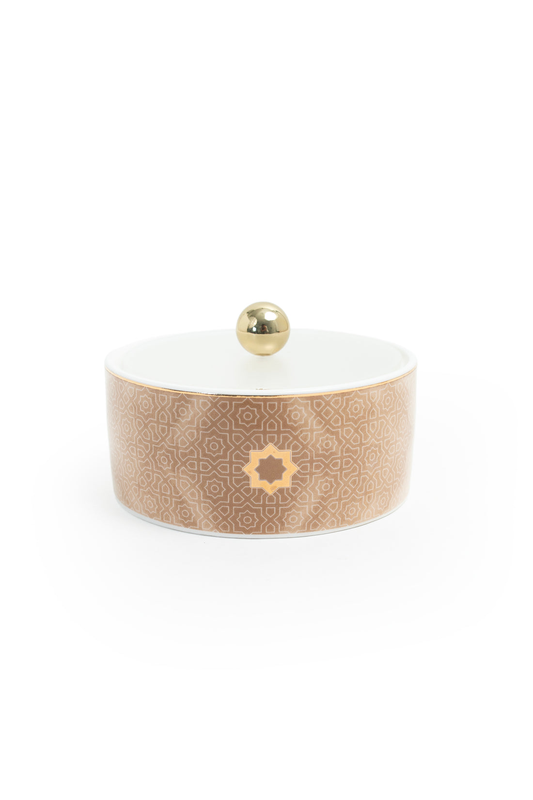 Ceramic Serving Bowl with Lid – Beige & White Arabic Geometric Design