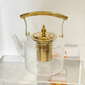 Elegant and artisanal, the Amira Teapot is crafted from thick hammered borosilicate glass, designed to retain heat while showcasing your favorite teas in full clarity. The golden handle, lid, and infuser add a luxurious touch, blending traditional charm with modern sophistication.