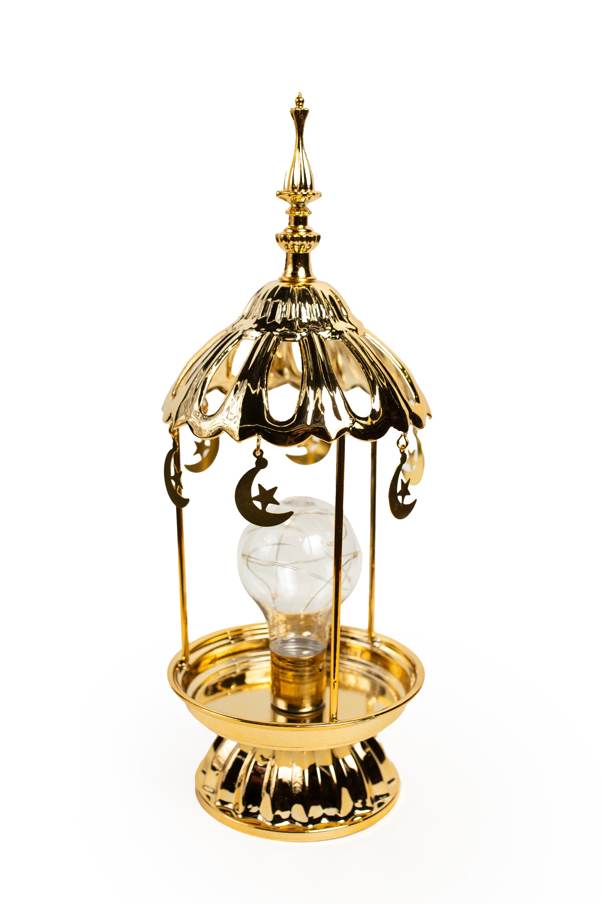 Illuminate your home with timeless elegance. The Golden Crescent Lantern Lamp combines traditional charm with modern lighting, making it a perfect statement piece for any space. Designed with a polished gold finish and adorned with delicate crescent moon and star charms, it captures the beauty of Islamic artistry while creating a warm, inviting glow.