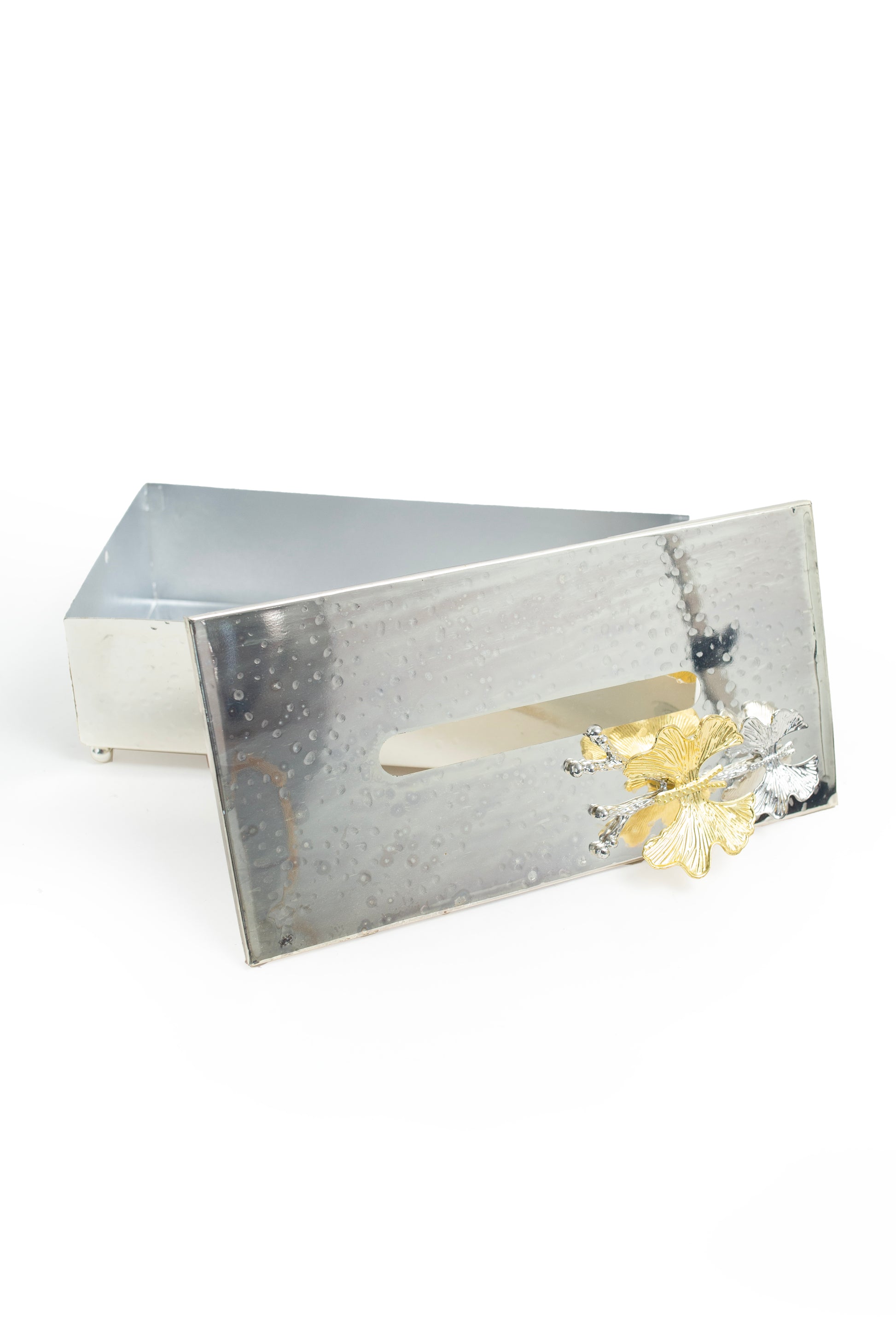 Add a touch of luxury to your space with this hammered metal tissue box holder, featuring an elegant dual-tone floral accent in gold and silver. The sleek rectangular shape and metallic finish blend seamlessly into both modern and classic interiors, while the decorative flower detail adds a refined statement.