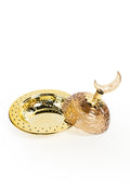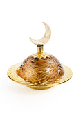 An exquisite blend of tradition and luxury, the Moonlight Crystal Date Bowl features a finely cut amber-toned glass dome adorned with a crescent moon detail. Resting on a golden hammered base tray, this piece is designed to elevate your table setting—perfect for presenting dates, sweets, or simply as a captivating decorative accent. Its luminous glow and intricate craftsmanship make it a timeless gift or centerpiece for any refined home.
