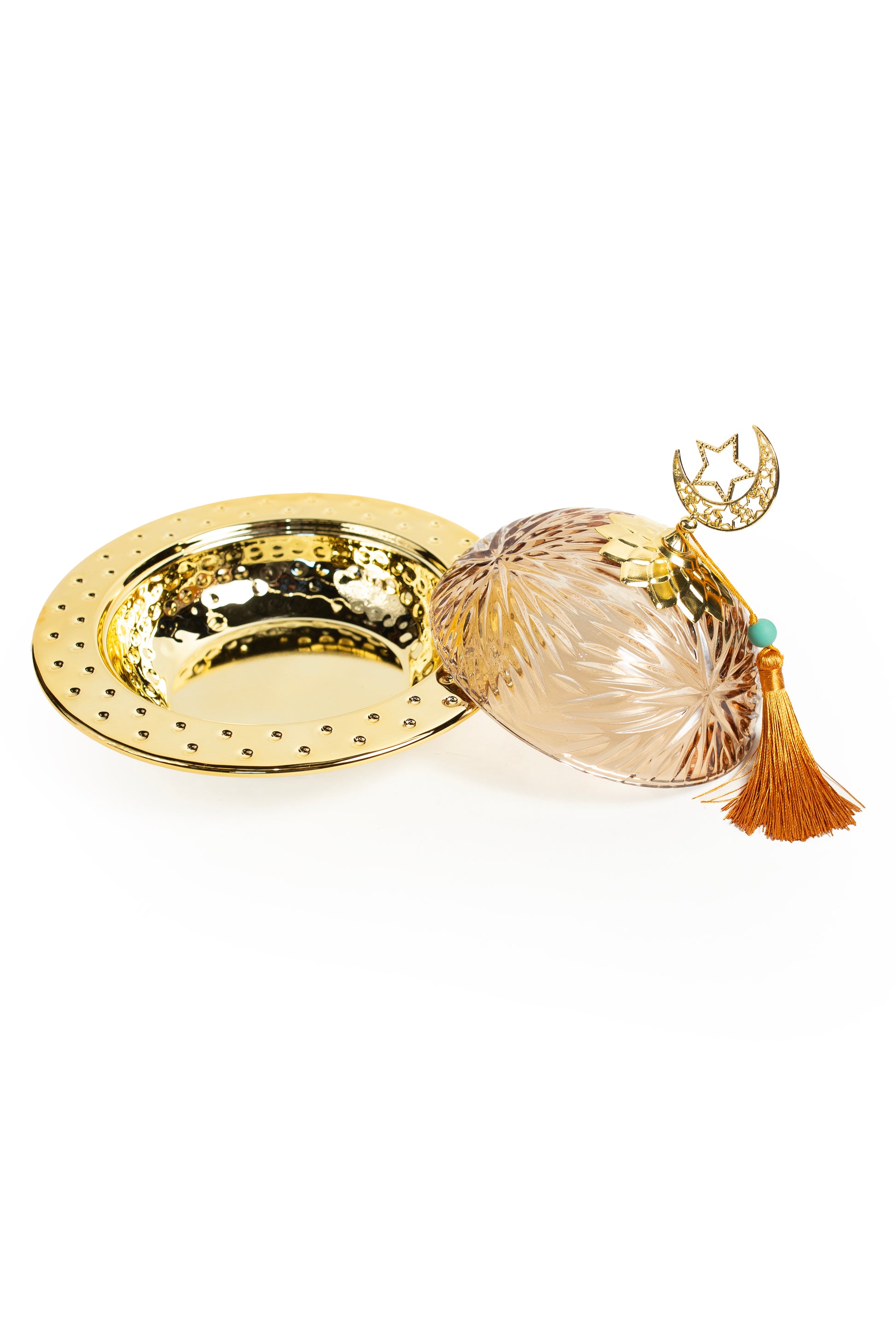 A luxurious blend of tradition and elegance, this crystal date bowl features a beautifully cut dome lid adorned with a golden crescent and star finial, complemented by an elegant orange tassel. The crystal pattern captures light from every angle, while the gold-plated base plate adds a rich, reflective glow to your table setting. Ideal for serving dates, sweets, or dried fruits, it also makes a thoughtful gift or centerpiece in any home.