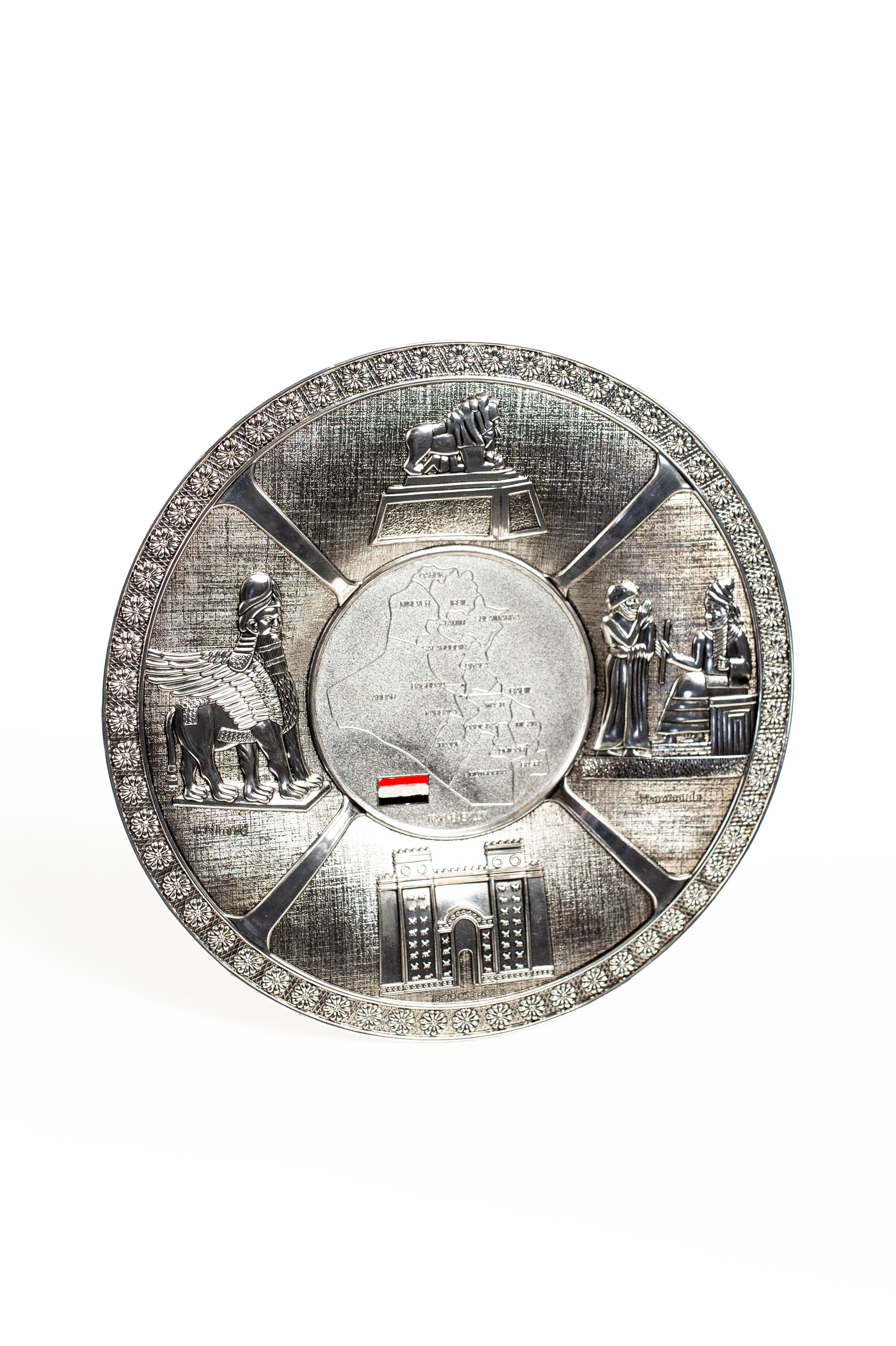 Celebrate the rich history and culture of Iraq with this stunning decorative metal plate. Beautifully crafted with embossed landmarks and symbols, it features iconic imagery including the Ishtar Gate, Winged Bull (Lamassu), Lion of Babylon, and Hammurabi’s Code — all surrounding a central map of Iraq with the national flag.