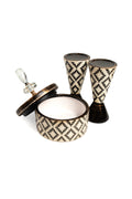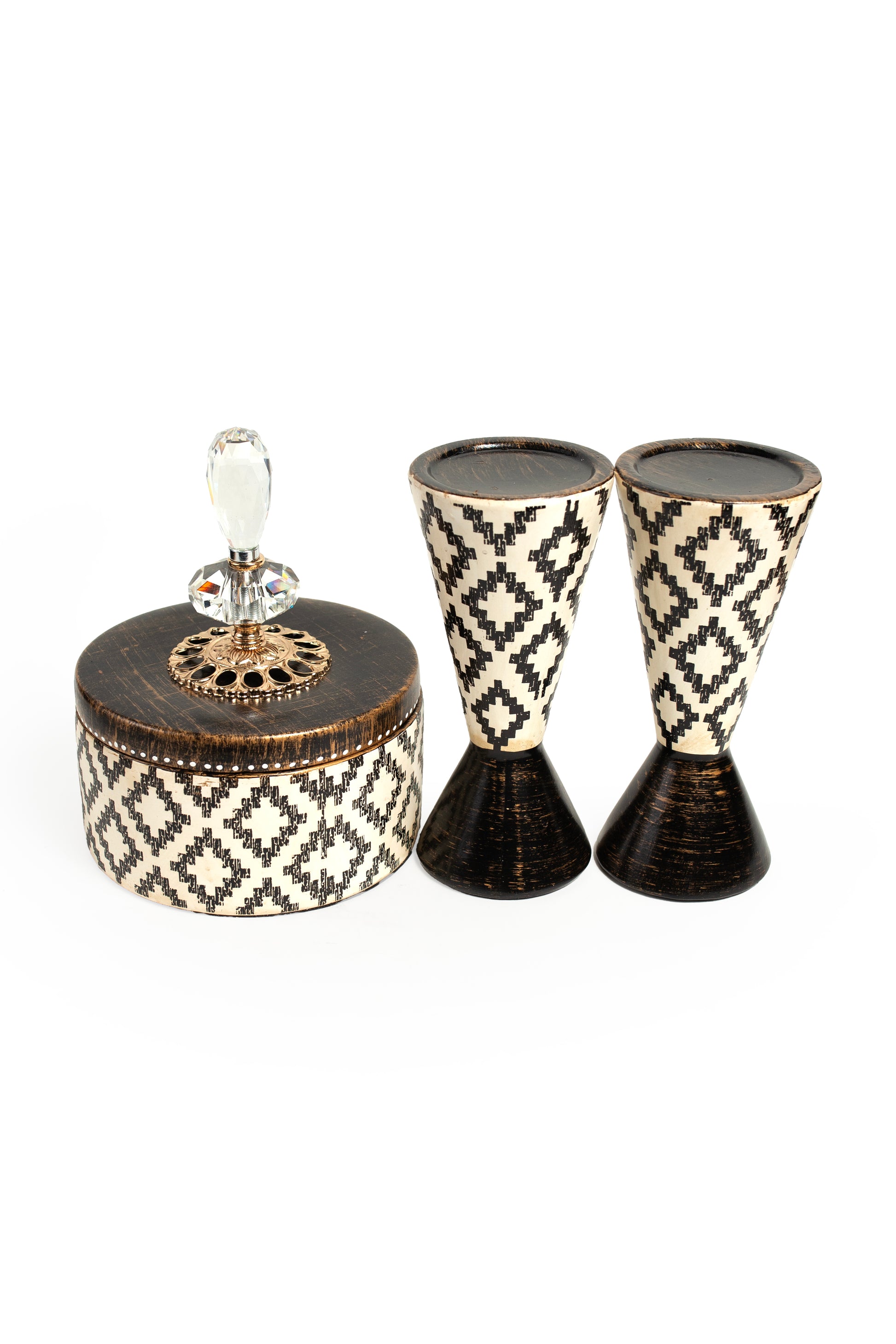 Add elegance and charm to your décor with this handcrafted mosaic set, featuring a lidded trinket box adorned with a crystal knob and two matching goblet-style pieces. The striking black-and-cream diamond pattern offers a modern yet timeless look, making it a versatile accent for any space.