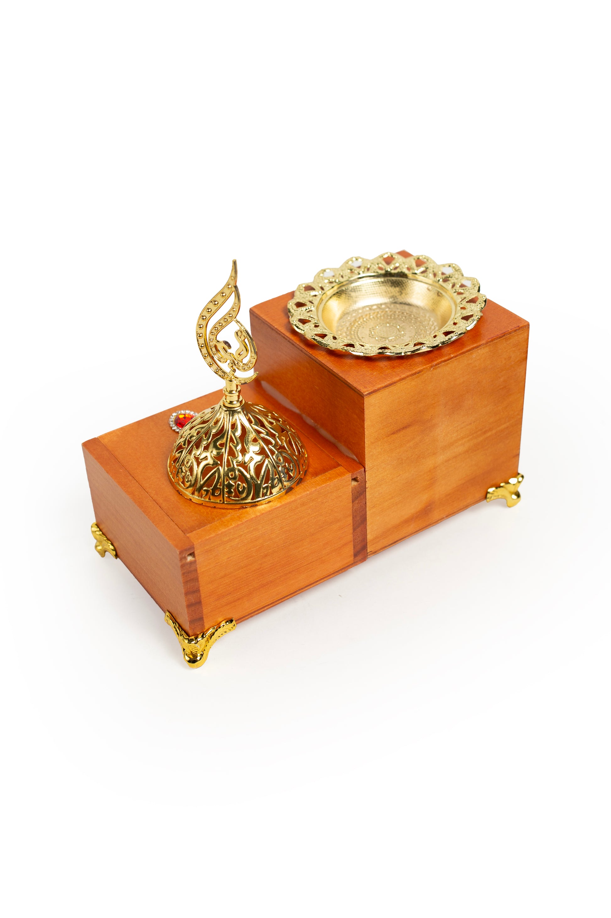 Elevate your incense rituals with this luxurious dual-chamber bakhoor burner. Crafted from warm-toned wood and adorned with golden accents and ornate calligraphy, this piece is both functional and decorative. One chamber houses the incense burner with a ventilated golden cover, while the adjacent drawer offers a discreet storage space for your bakhoor or charcoal. A true centerpiece for any elegant home.