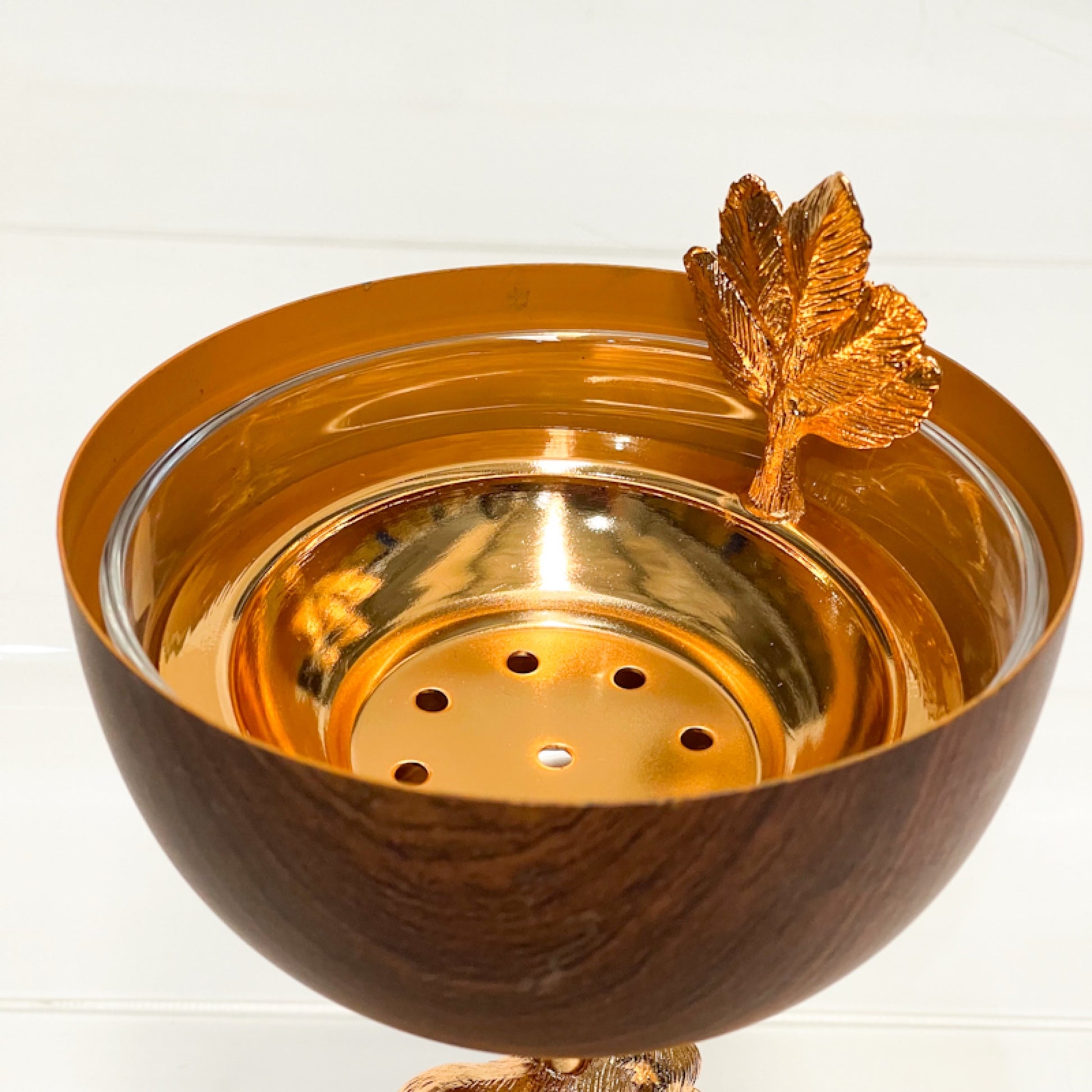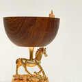 Experience the art of incense burning in luxury with the Imperial Stallion Bakhoor Burner, a magnificent blend of metal, glass, and wood-inspired textures. Designed for both elegance and functionality, this 18cm x 11cm burner features a golden stallion figurine, a wood-finish upper bowl, and a gold-plated base, making it a striking decorative piece.
