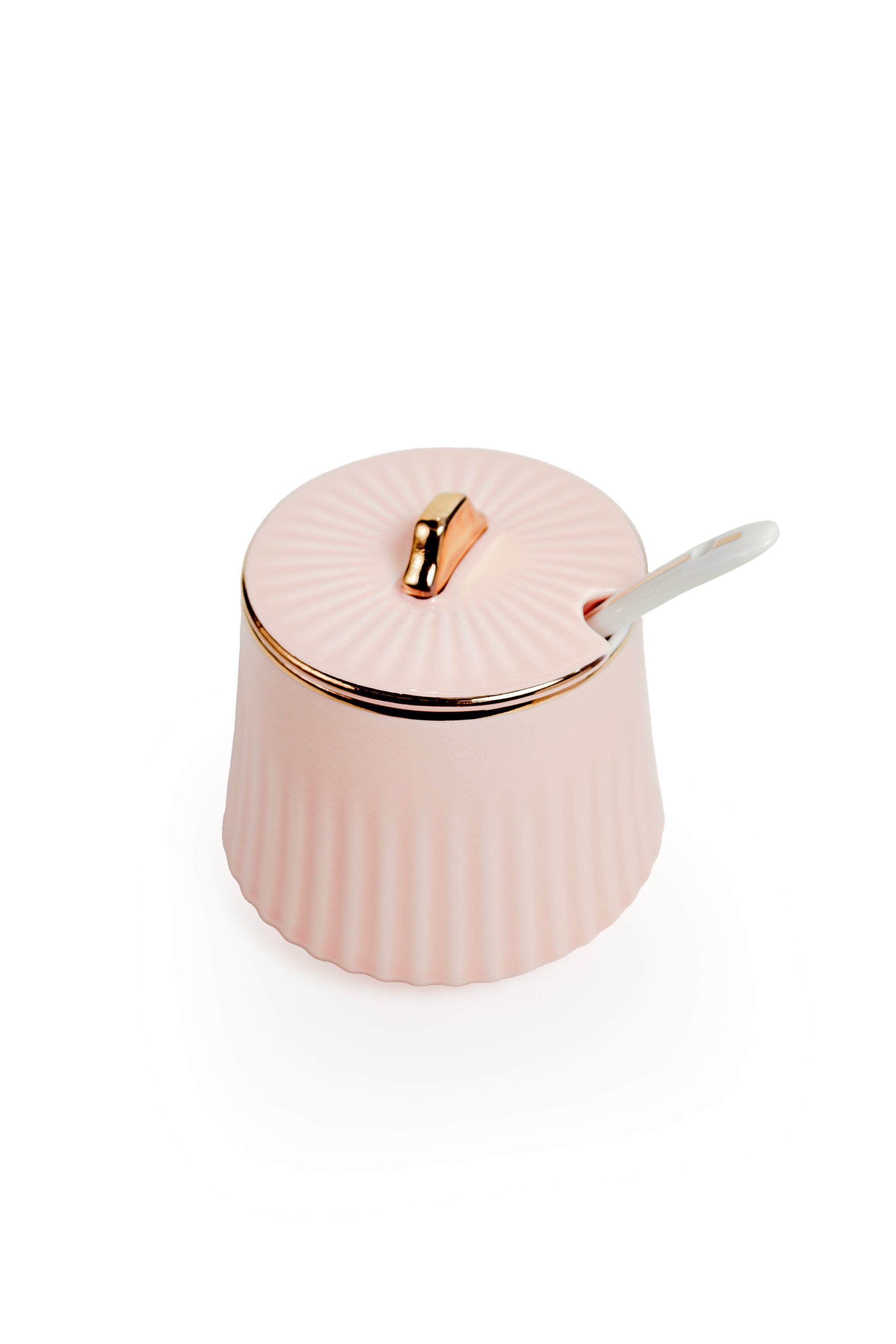Add a touch of elegance to your table with this blush pink ceramic sugar pot, beautifully finished with a gold-accented lid and a matching ceramic spoon. The fluted design and soft pastel tone bring both charm and sophistication, making it a stylish addition to your kitchen or dining décor.
