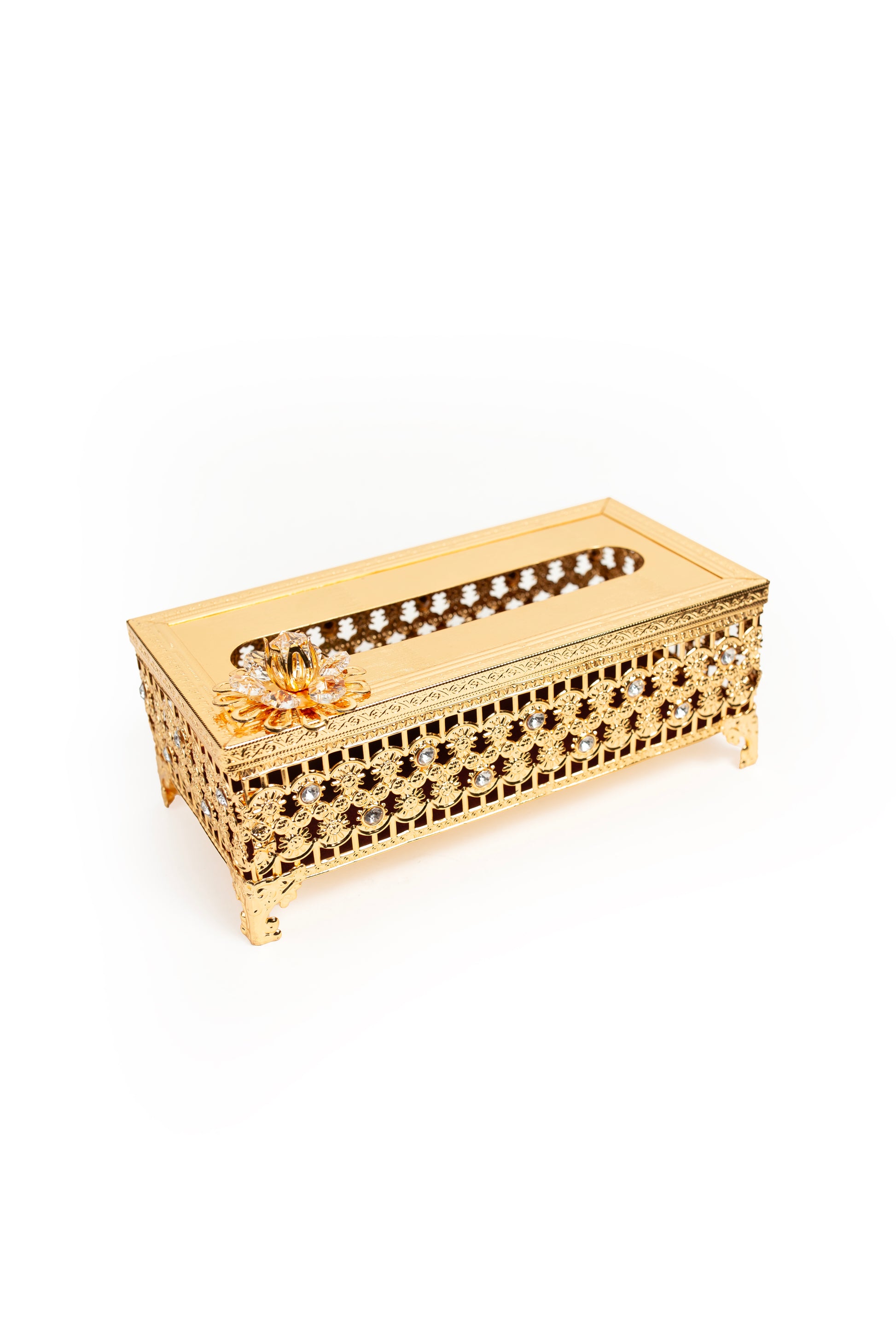 Keep your treasures safe in timeless style with this ornate golden rectangular box, beautifully crafted with an intricate floral lattice design and a crystal-accented lid. Resting on elegant raised legs, this piece exudes luxury and refinement, making it a striking addition to any vanity, dresser, or coffee table.